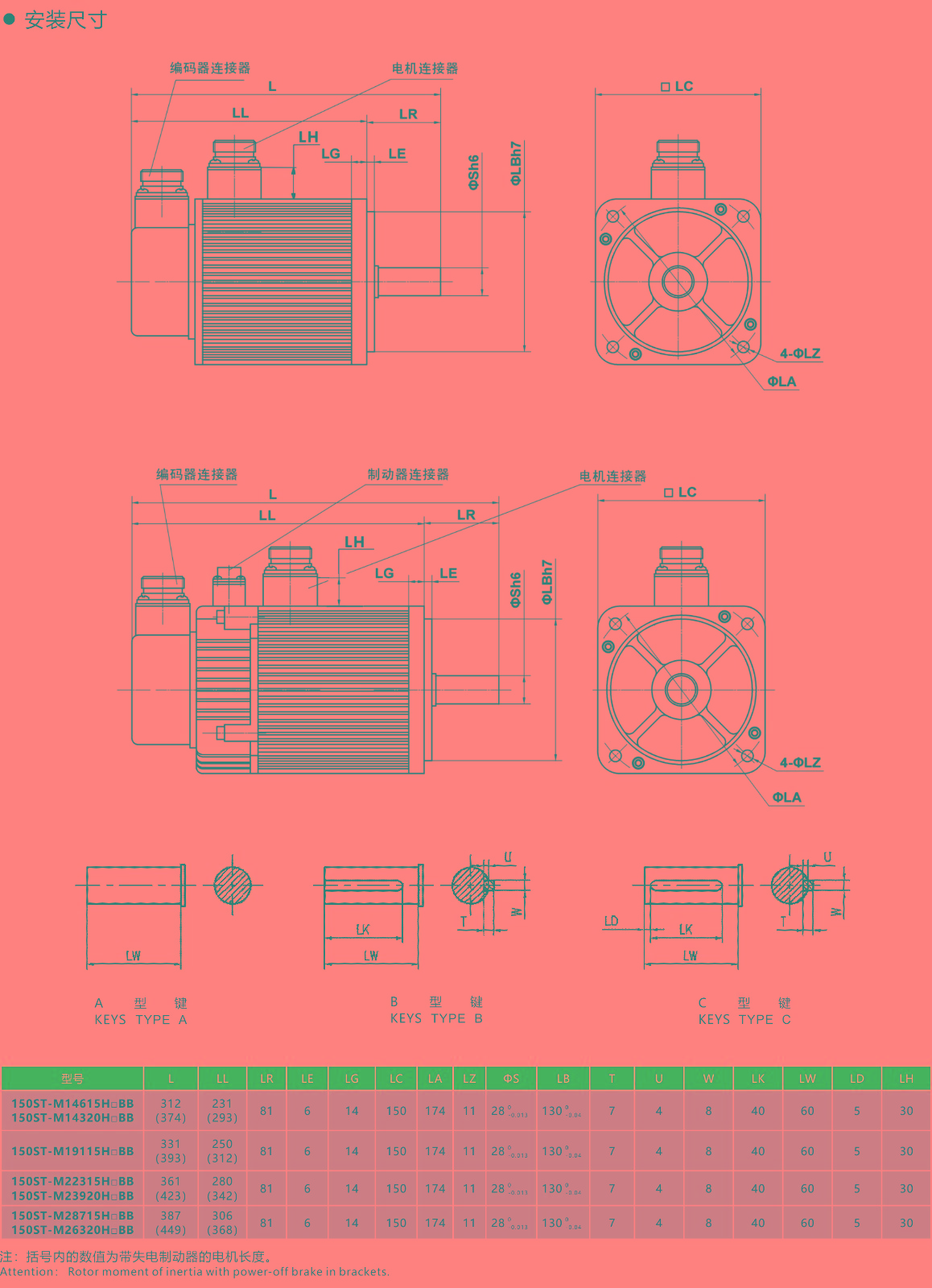 额定功率范围:2.5~5.5kw,额定转矩范围:14.3~28.7Nm,额定转速:1500,2000,2500rpm,最高转速:3000rpm,适配220v和380v电压伺服驱动器,具有高响应\高精度\高防护\低转速波动\低温升\低振动噪音等特点,可根据客户要求配置17位\23位\25位编码器